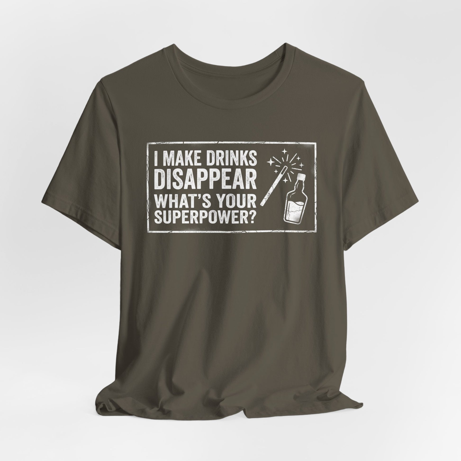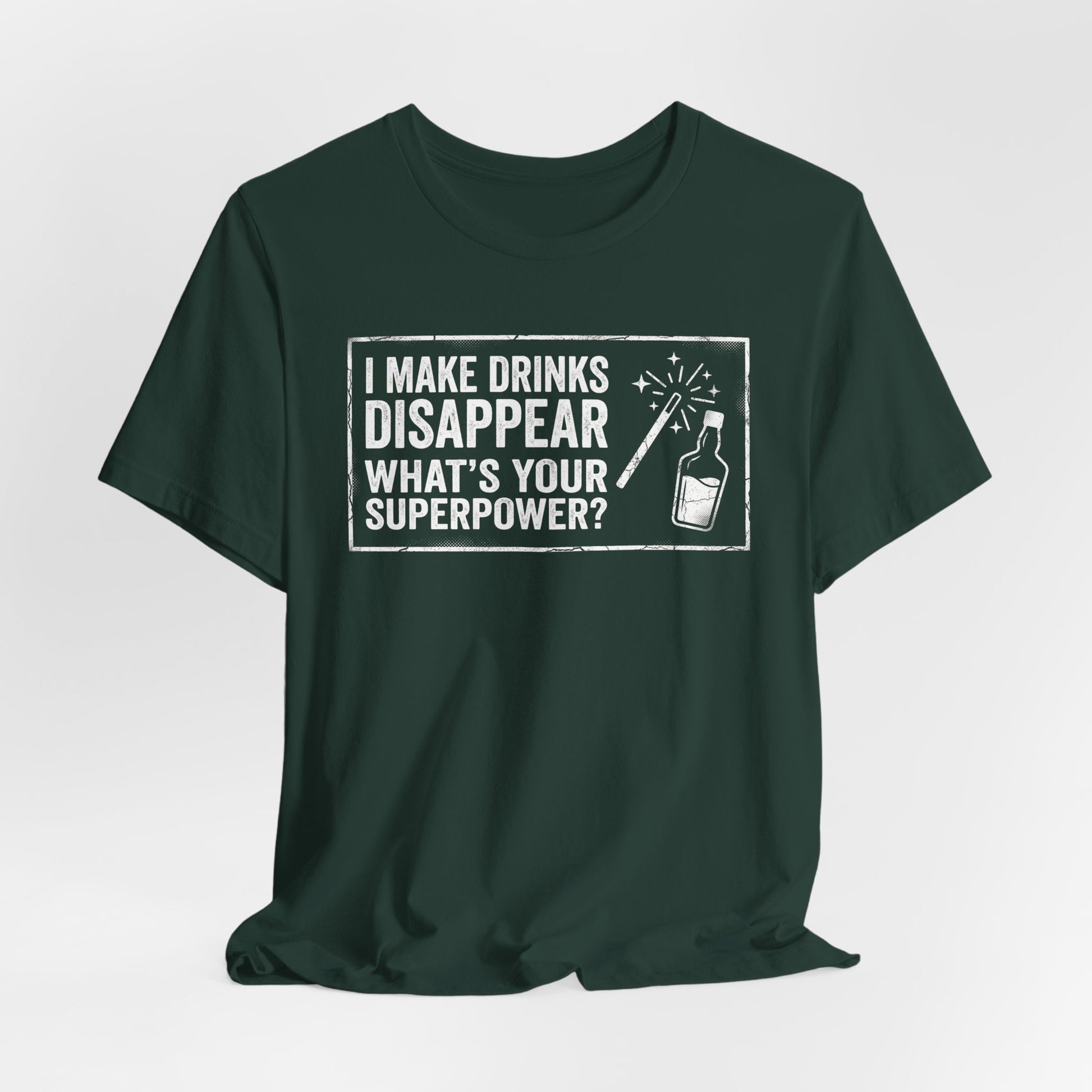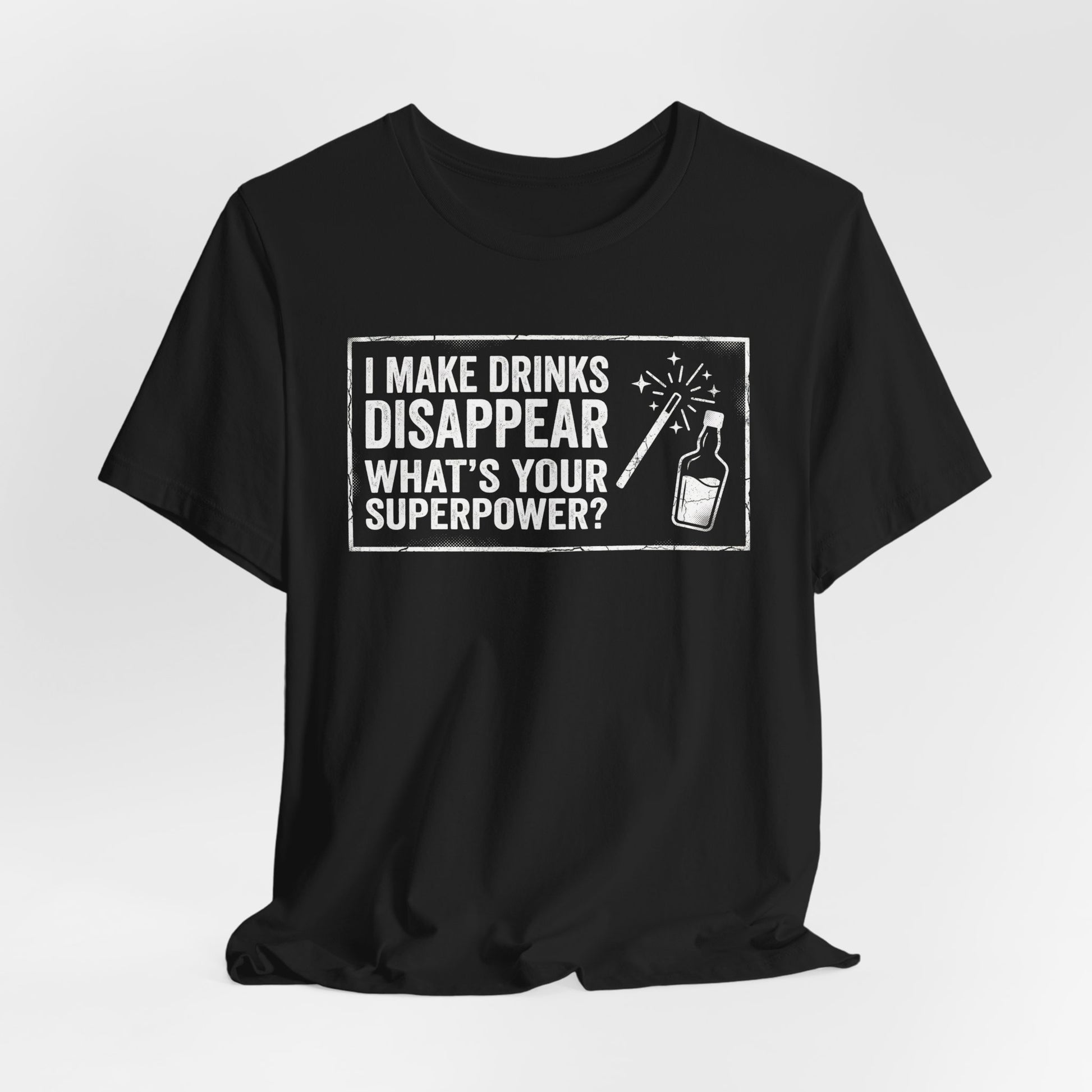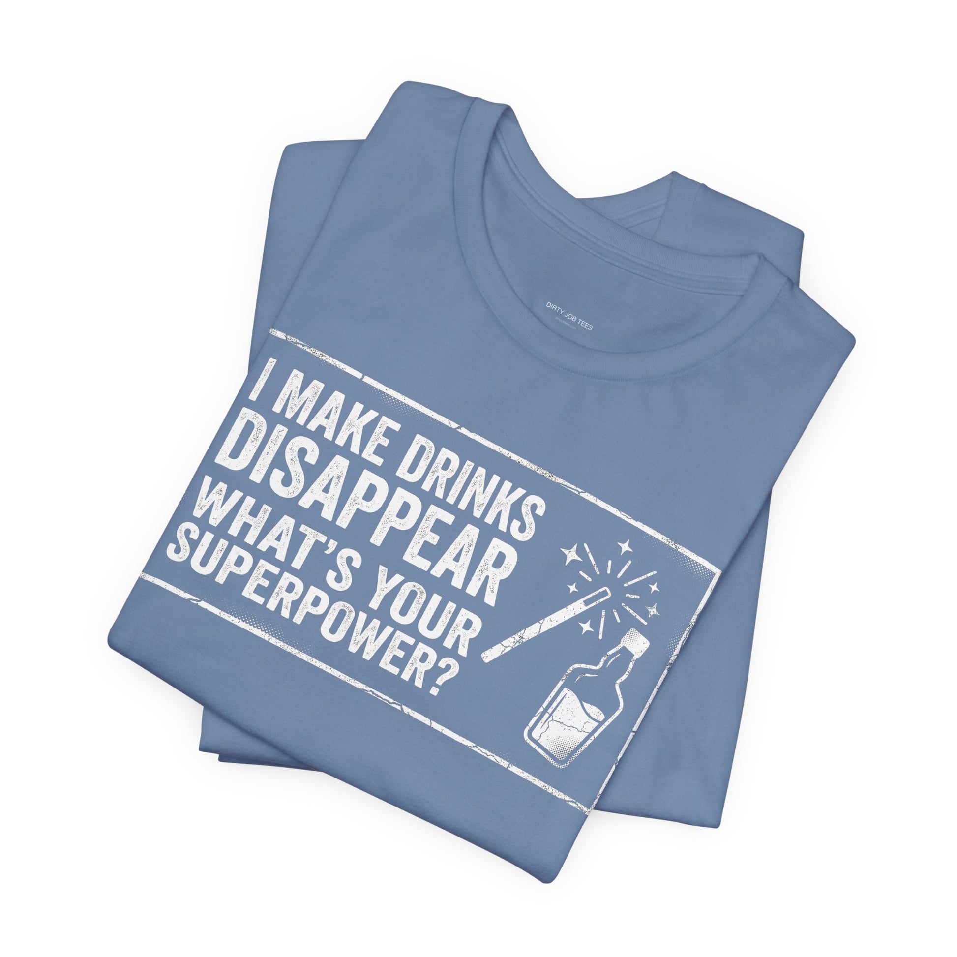 I Make Drinks Disappear — What's Your Superpower? A fun and bold statement for bartenders who work magic behind the bar every shift. Premium Bella+Canvas CVC tee.